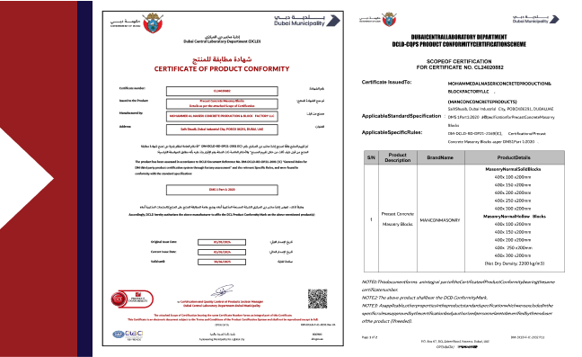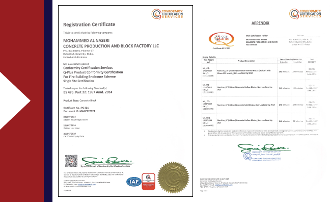 Regular in-house testing of products to comply with BS, ASTM, DCL and ESTIDAMA